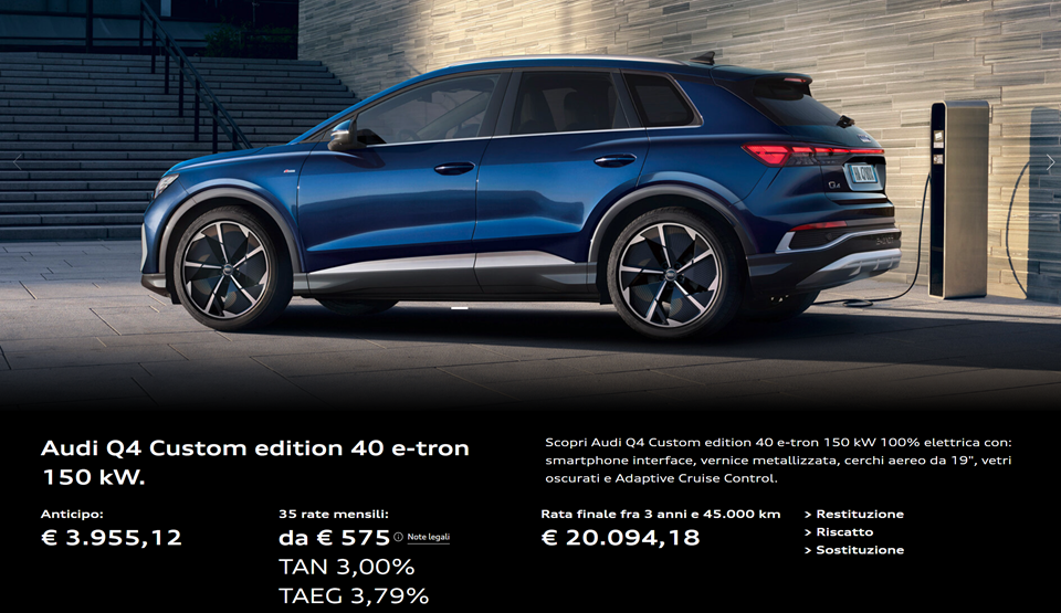 Offerta riferita al modello Audi Q4 e-tron in configurazione esemplificativa. Prezzo, dotazioni, condizioni economiche e finanziarie sono soggetti a verifica e conferma presso la Concessionaria aderente. Le condizioni di finanziamento (anticipo, durata, importo delle rate, TAN, TAEG, valore futuro garantito ed eventuali servizi accessori) sono da intendersi come puramente indicative e saranno determinate in base alla proposta finanziaria disponibile al momento della sottoscrizione del contratto, previa approvazione dell’ente finanziatore. Offerta riservata a Clienti Privati, valida salvo approvazione di Audi Financial Services e fino ad esaurimento disponibilità. Informazioni Europee di Base sul Credito ai Consumatori (IEBCC), Fogli Informativi e condizioni contrattuali dei servizi accessori sono disponibili presso le Concessionarie Audi. La vettura raffigurata è puramente indicativa. Eventuali accessori ed equipaggiamenti aggiuntivi possono comportare variazioni di prezzo. Consumi di energia, autonomia ed emissioni di CO₂ determinati secondo il ciclo WLTP. I valori possono variare in funzione dell’allestimento, dello stile di guida e di altri fattori non tecnici. Per ulteriori informazioni si invita a rivolgersi alla Concessionaria Audi.